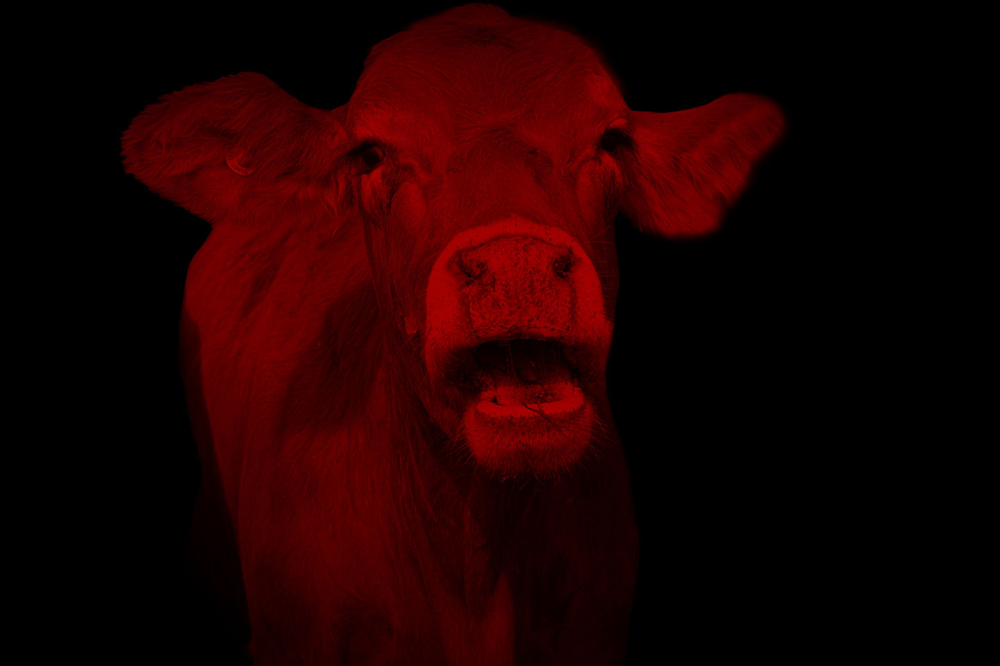 The work employs reflections, fabrics, smoke, and natural pigments to create layers of perception and resonance, where texture and light flow across the scene, revealing what is not always visible. In its installation, the images are printed on translucent textiles suspended from ceiling to floor, allowing viewers to walk among them. This immersive format multiplies the planes of vision: a cow appears in its natural presence, while behind it, echoed in red, emerges its spectral double—an imprint of memory, sacrifice, and vitality.